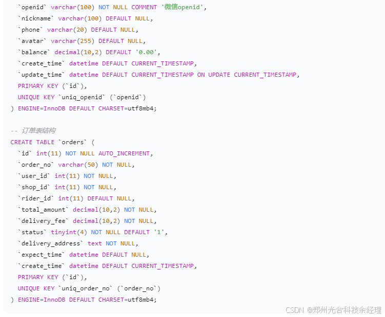 在数据库设计阶段,我们遵循了规范化设计原则,同时兼顾查询性能。用户表设计重点考虑了微信生态的集成,存储openid等必要信息。订单表的设计则充分体现了业务流程的完整性。