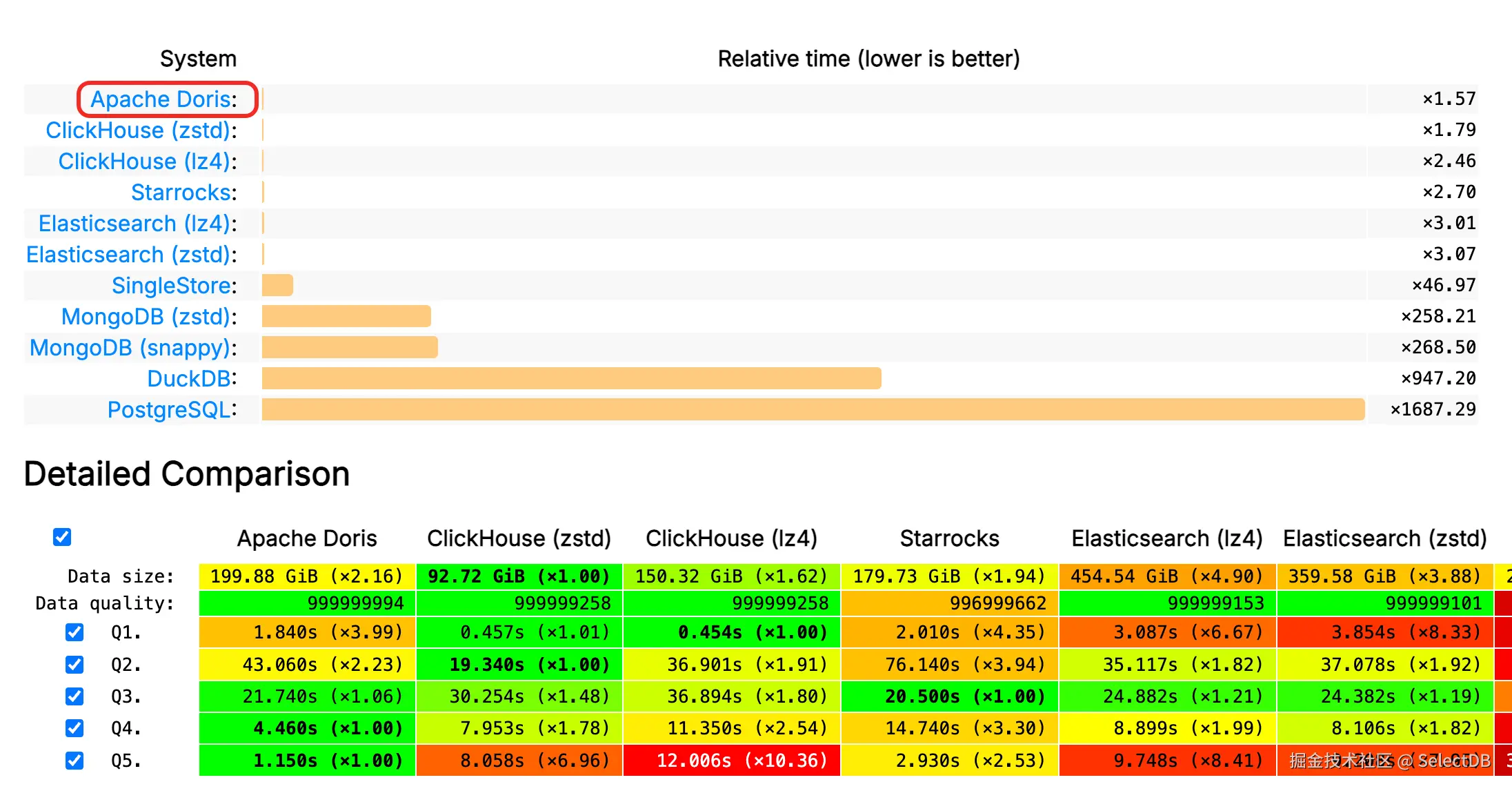 从榜单可以清晰地看到,Doris (分数 1.57) 具备压倒性的性能优势:其速度约是 MongoDB (分数 258.21) 的 164 倍,是 PostgreSQL (分数 1687.29) 的 1074 倍。同时,以近 2 倍的优势领先于 Elasticsearch (分数 3.01),成为更具竞争力的选择。