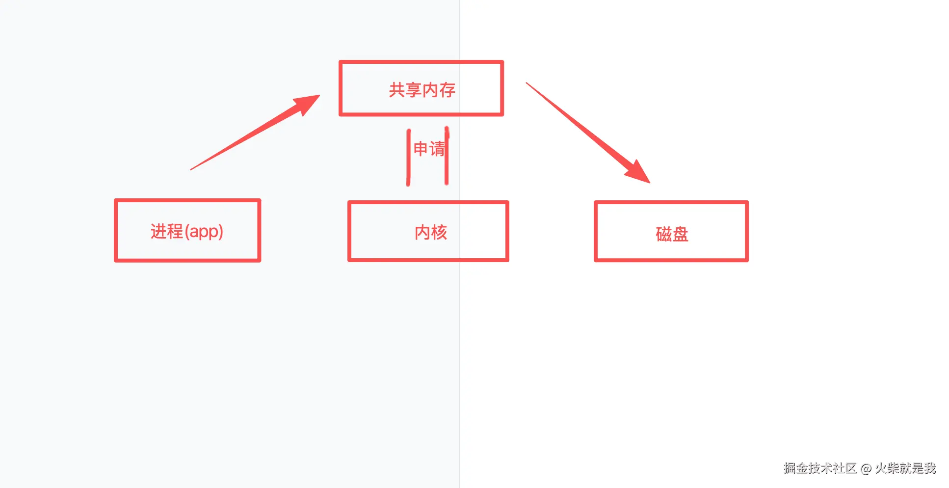 对于mmap解决的就是去除了把数据在用户缓存 内核缓存直接 拷贝来拷贝去的步骤。改为操作由内核创建的一块物理内存。这个区域进程可以直接访问,内核也可以直接访问。大家说的内存映射就是这块共享内存跟磁盘内存的映射,app读写数据都是直接操作共享内存,app读取发现没有数据,内核负责区磁盘读取放到共享内存。app写数据,内核负责同步数据到磁盘。