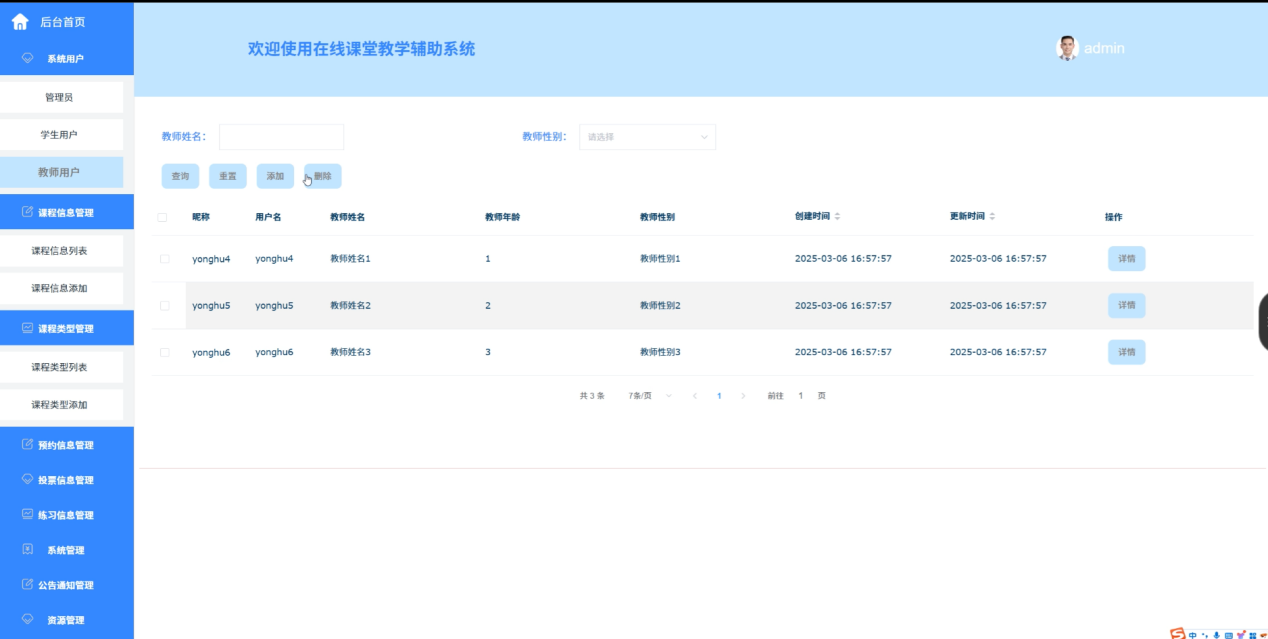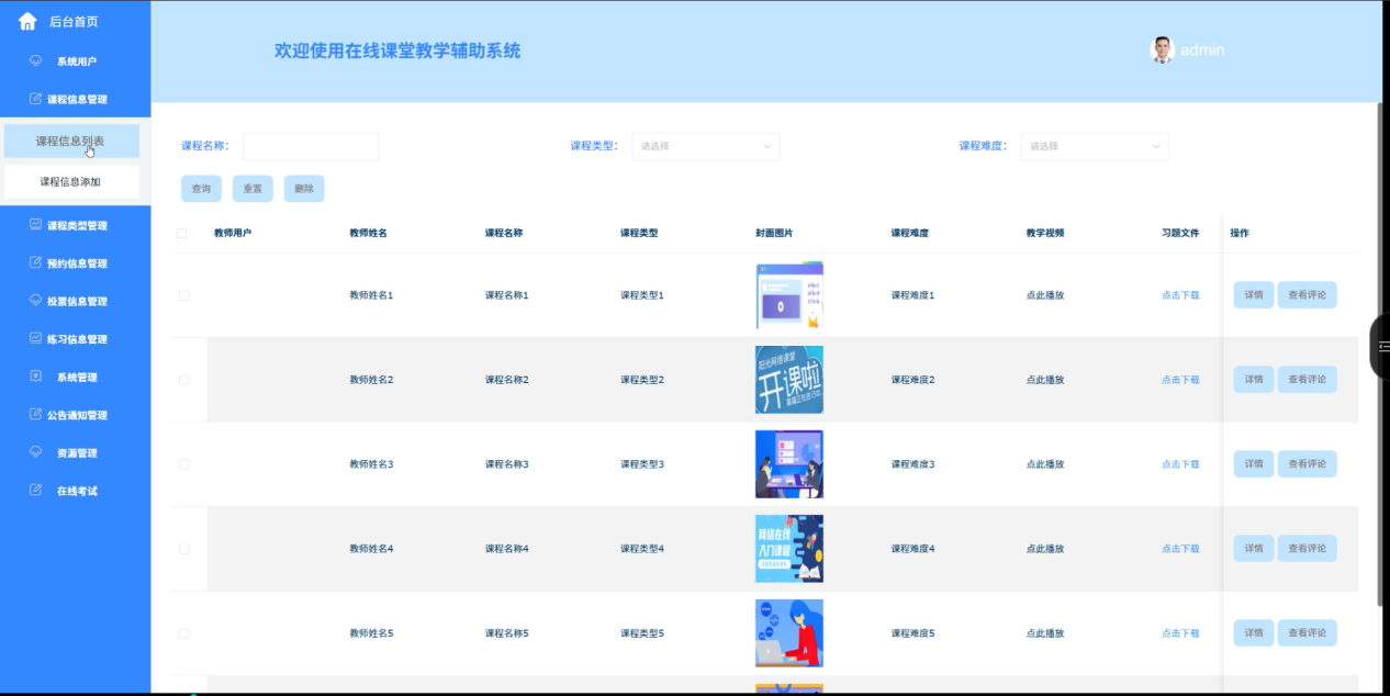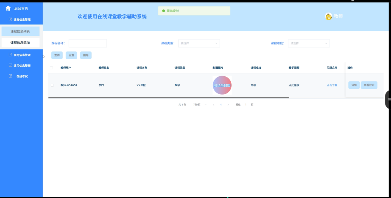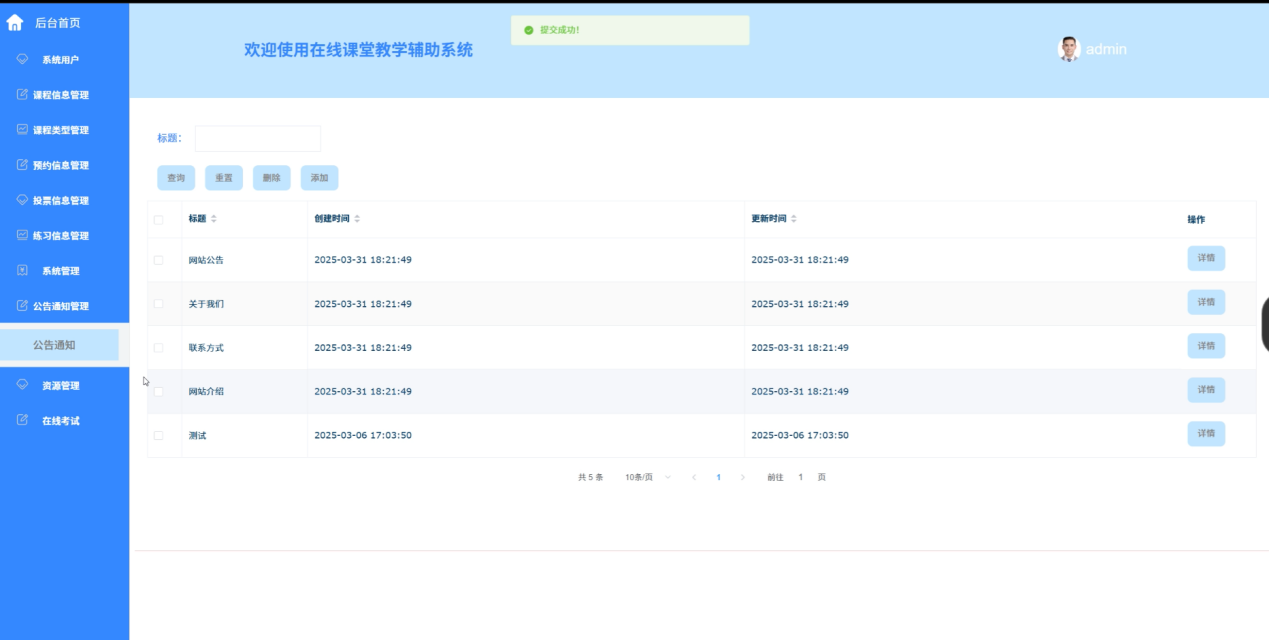 The online classroom teaching assistance system is developed based on the SpringBoot framework, aiming to provide an efficient and convenient teaching support platform for the education industry. With the development of Internet education, traditional classroom teaching has gradually transformed to online education. Especially during the epidemic, the demand for online education has increased significantly. This system provides different functional modules for administrators, teachers, and students, meeting the diverse needs of various users. Administrators can manage course information, appointment information, voting, and practice content through the system backend. They can also manage online exams, including question banks, error records, and test paper lists. Teacher users can create and manage courses, process online exam and practice information, and facilitate tracking and evaluation of teaching progress. Student users can browse course information, participate in online exams, view announcements and campus information, make appointments and manage learning tasks, further improving learning efficiency and interactivity.