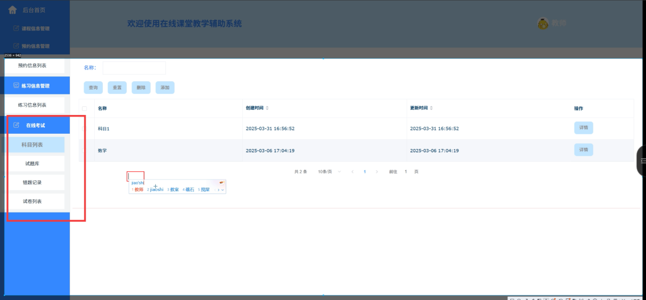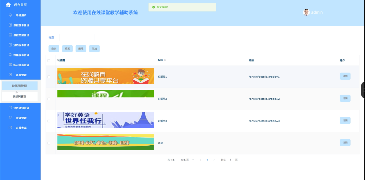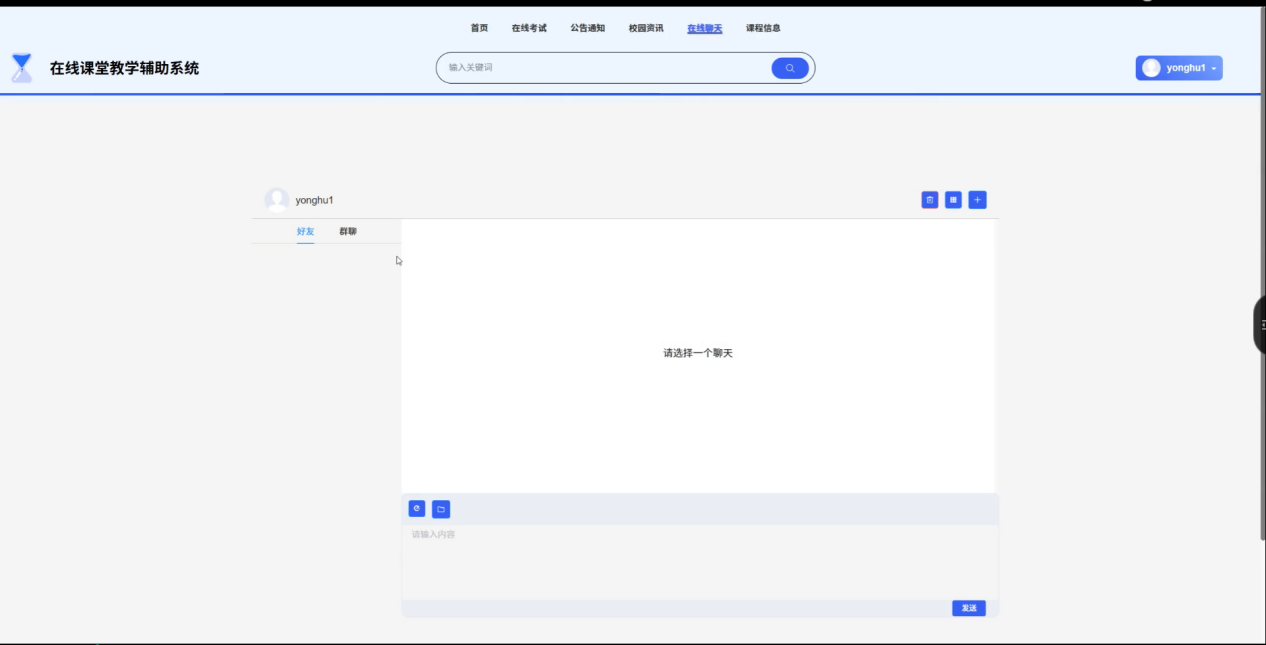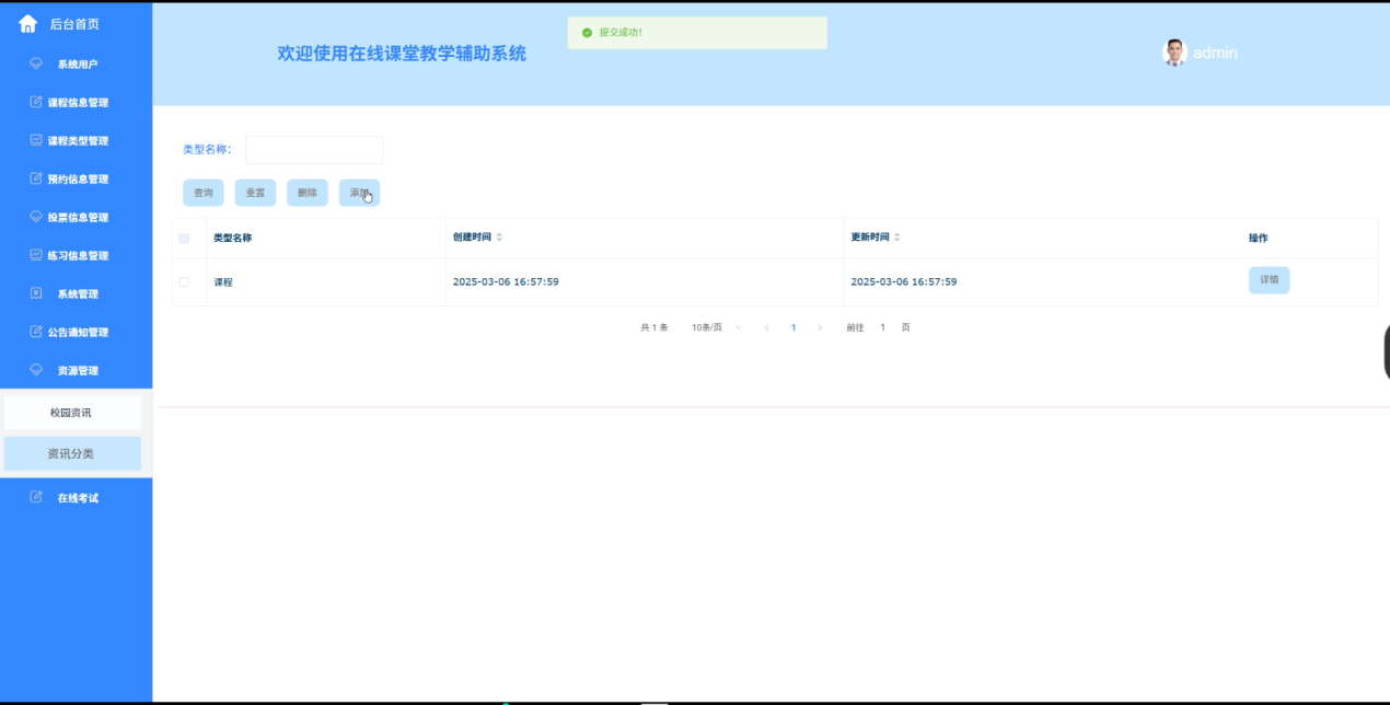 The online classroom teaching assistance system is developed based on the SpringBoot framework, aiming to provide an efficient and convenient teaching support platform for the education industry. With the development of Internet education, traditional classroom teaching has gradually transformed to online education. Especially during the epidemic, the demand for online education has increased significantly. This system provides different functional modules for administrators, teachers, and students, meeting the diverse needs of various users. Administrators can manage course information, appointment information, voting, and practice content through the system backend. They can also manage online exams, including question banks, error records, and test paper lists. Teacher users can create and manage courses, process online exam and practice information, and facilitate tracking and evaluation of teaching progress. Student users can browse course information, participate in online exams, view announcements and campus information, make appointments and manage learning tasks, further improving learning efficiency and interactivity.