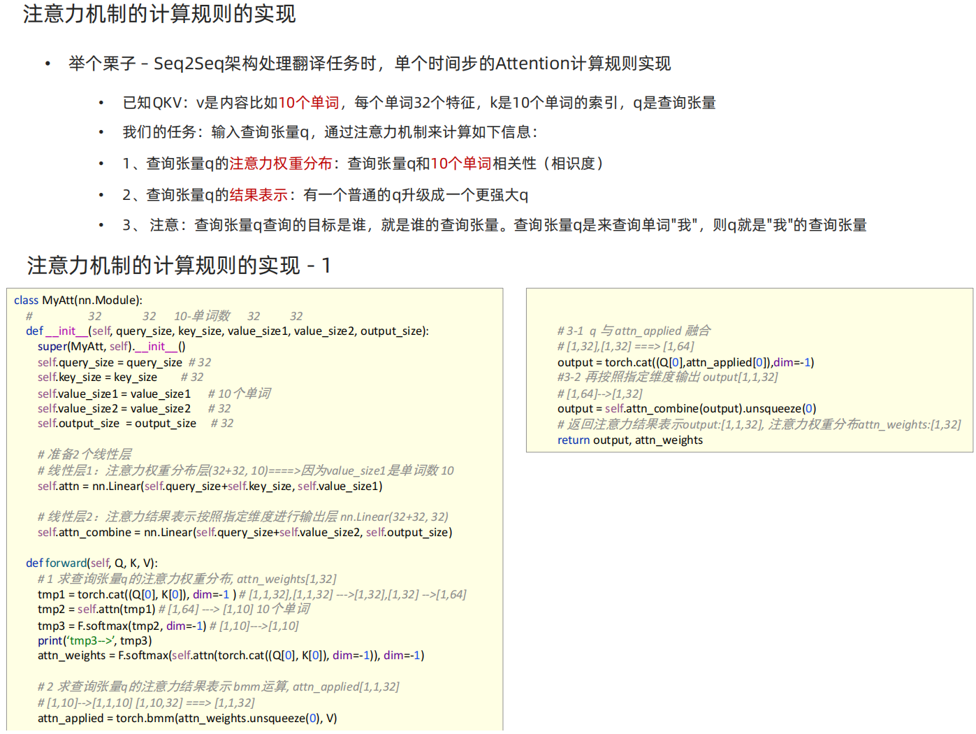 # 有QKV:q是查询张量其形状[1,1,32];k索引张量[1,1,32];v是内容10个单词,每个单词32个特征[1,10,32]