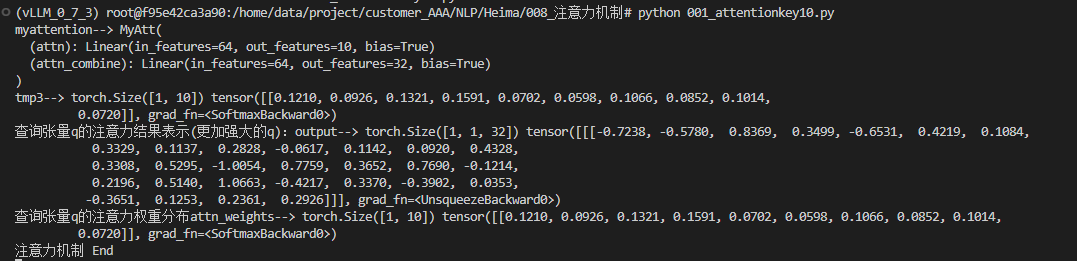 # 返回注意力结果表示output:[1,1,32], 注意力权重分布attn_weights:[1,10]