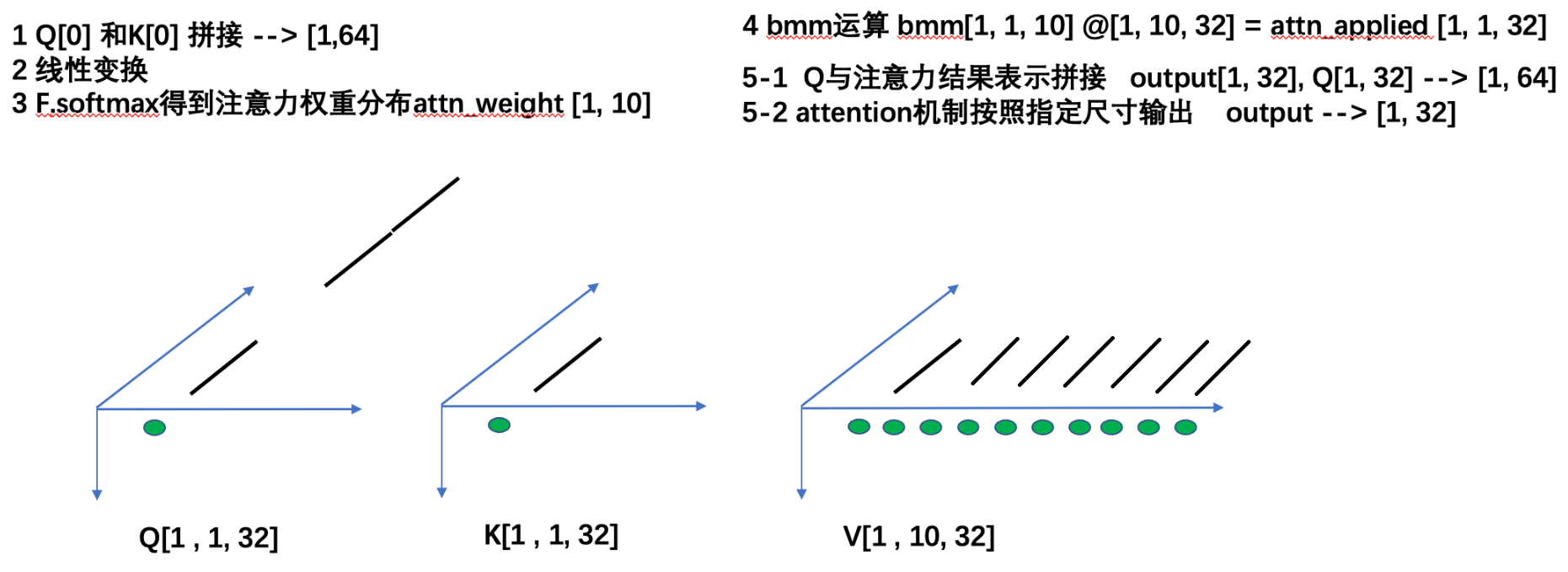 attn_applied = torch.bmm(attn_weights.unsqueeze(0), V) # [1,10]-> [1,1,10]@[1,10,32]->[1,1,32]