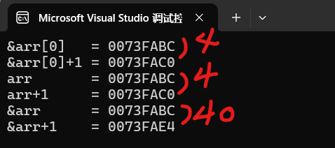 我们可以观察到&arr[0],取出首元素的地址,+1(&arr[0]+1)跳过4个字节(跳过一个元素)