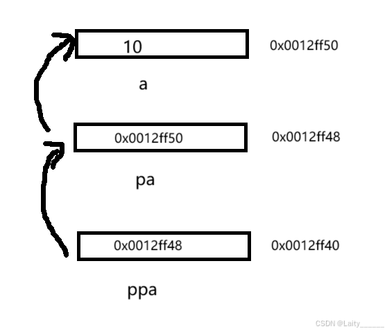 - **ppa先通过*ppa找到pa,在通过对pa进行解引用的操作:*pa找到a