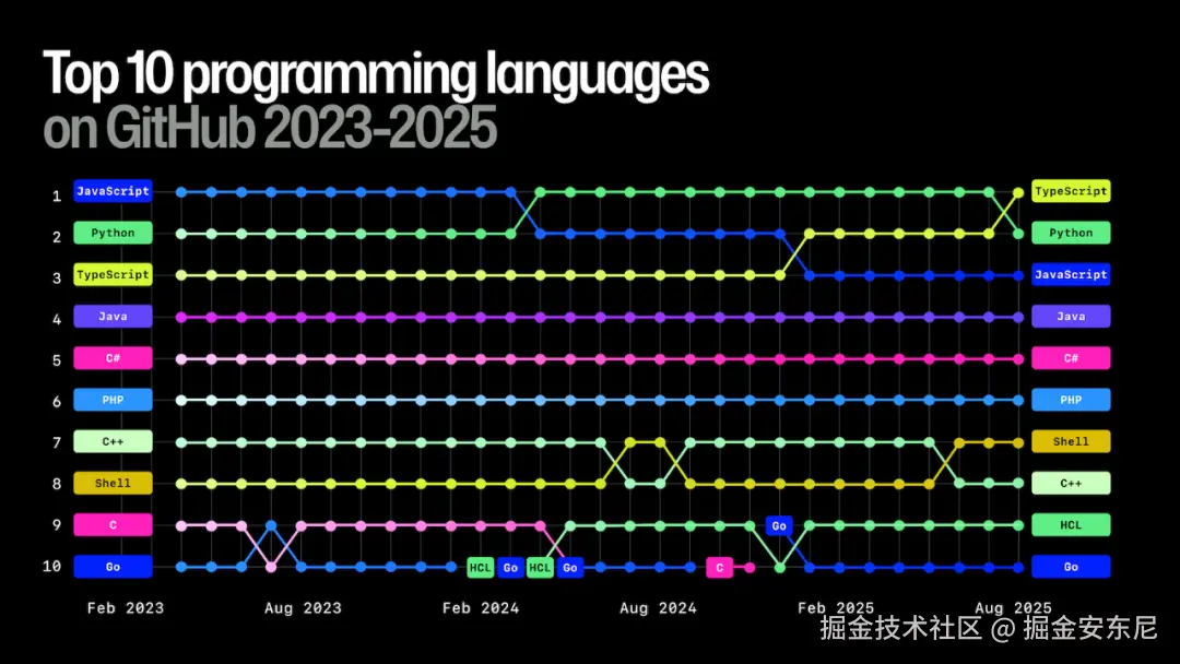 Octoverse 2025 最突出的数据之一显示 AI 正在改变语言偏好。开发者正转向能让 AI 辅助编码更可靠、更可维护的类型语言。