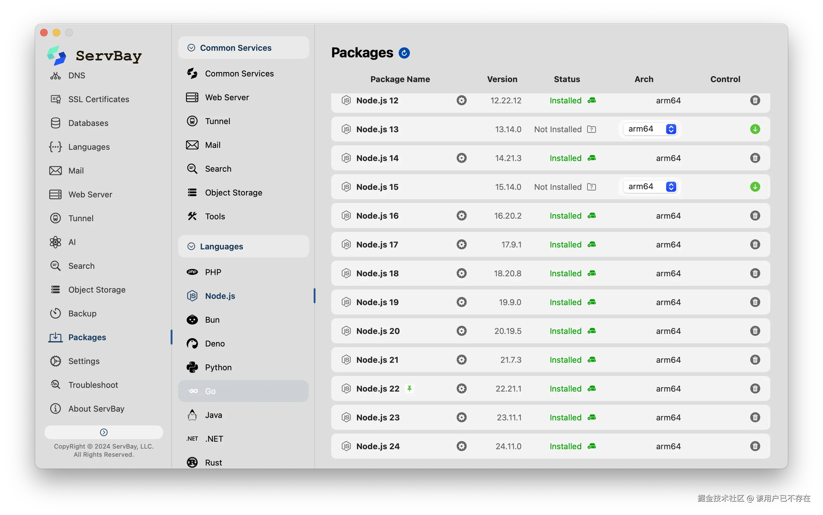 之所以推荐 ServBay ,是因为它提供了一个隔离的集成开发环境,允许开发者通过图形化界面一键部署和管理包括 Node.js、Rust 在内的多种服务。这种方式避免了使用版本管理器(如 nvm)在系统全局范围内频繁切换的复杂性,也杜绝了传统包管理器(如 Homebrew)可能带来的依赖混乱,干净又卫生。