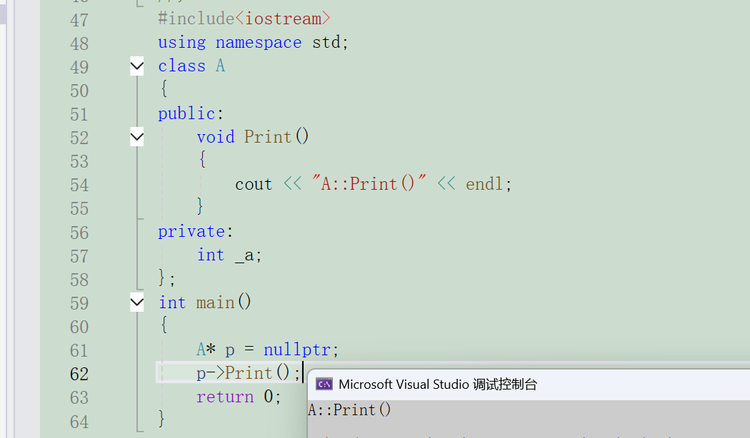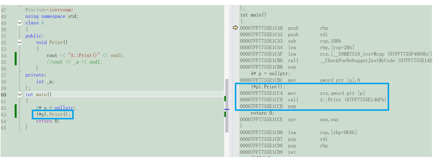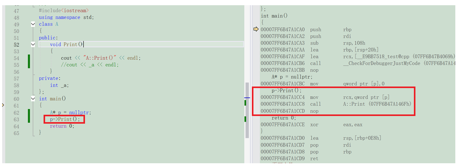 在上面代码中其实最让人迷惑的就是p->Print(),这里好像是空指针的解引用啊,这难道不会运行崩溃嘛?