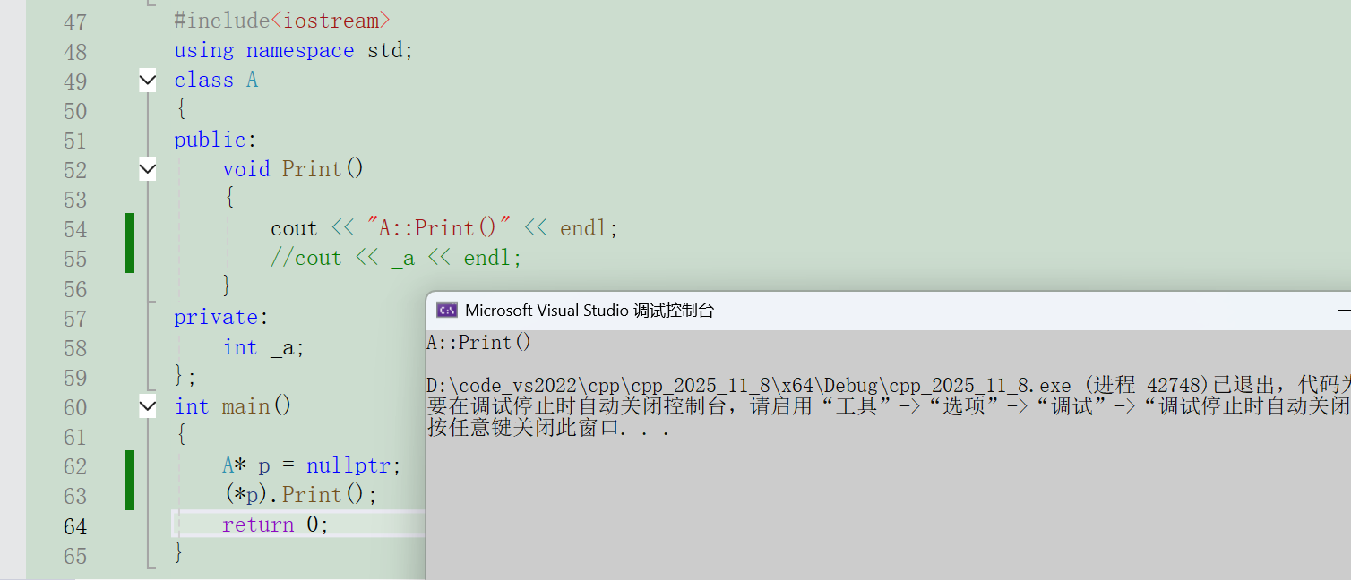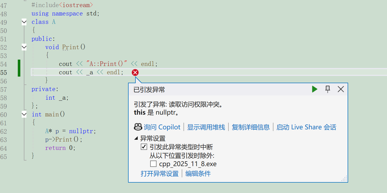 但是如果在Print函数内部访问成员变量则会运行崩溃