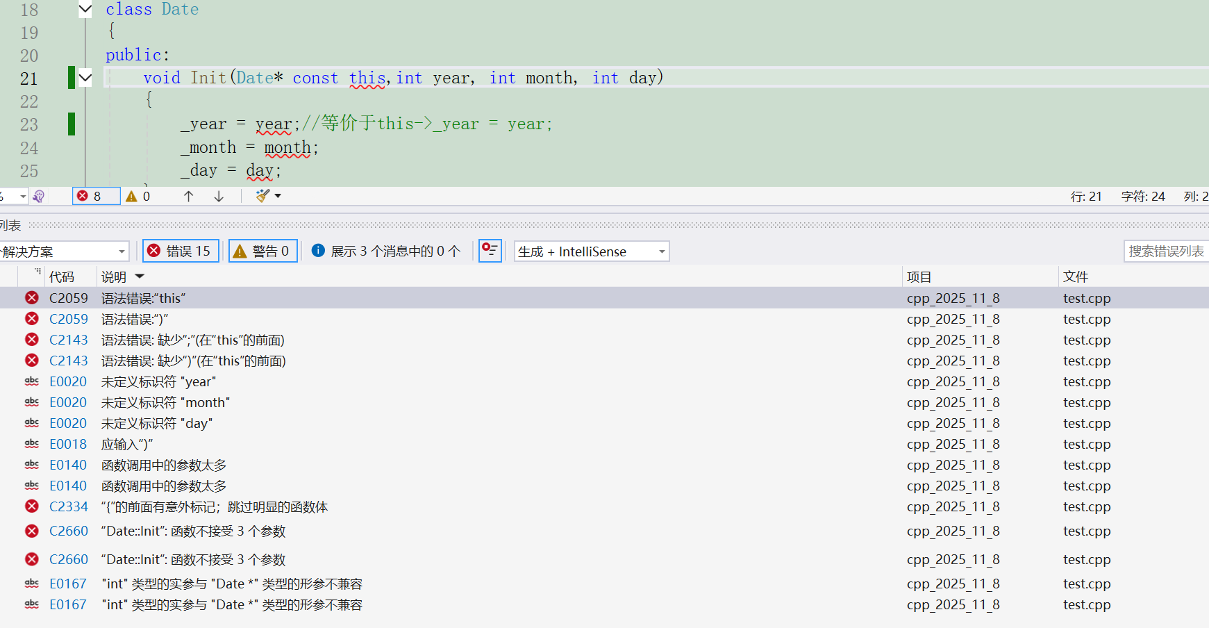 C++规定this指针不能在实参和形参的位置显示写 ,在形参和实参位置由编译器在编译时候处理 ,只有在成员函数内部可以显示运用this指针