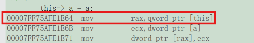 this指针内存区域说明:我们也看到this指针就是函数的参数 ,所以this指针是存在栈区 的,不过有时候编译器为了加快速度也会将其放入寄存器 之中这个汇编指令便是将