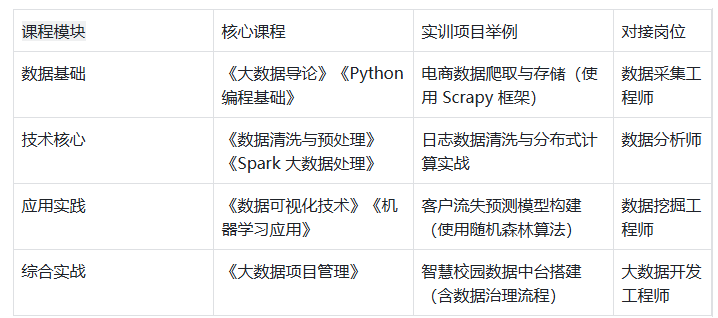 数据基础模块作为大数据学习的基石,通过《大数据导论》让学生全面了解大数据的概念、发展历程和应用领域,激发他们对大数据的兴趣;《Python 编程基础》则为学生提供了必备的编程技能,让他们能够使用 Python 语言进行基本的数据处理和分析。在实训项目中,学生使用 Scrapy 框架进行电商数据的爬取与存储,初步体验数据采集的过程,为成为数据采集工程师打下基础。
