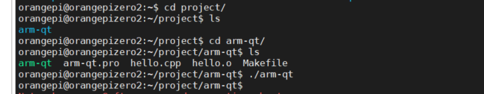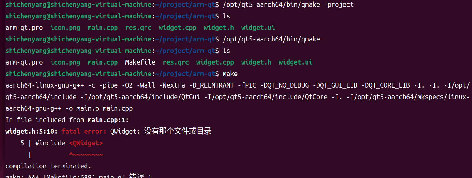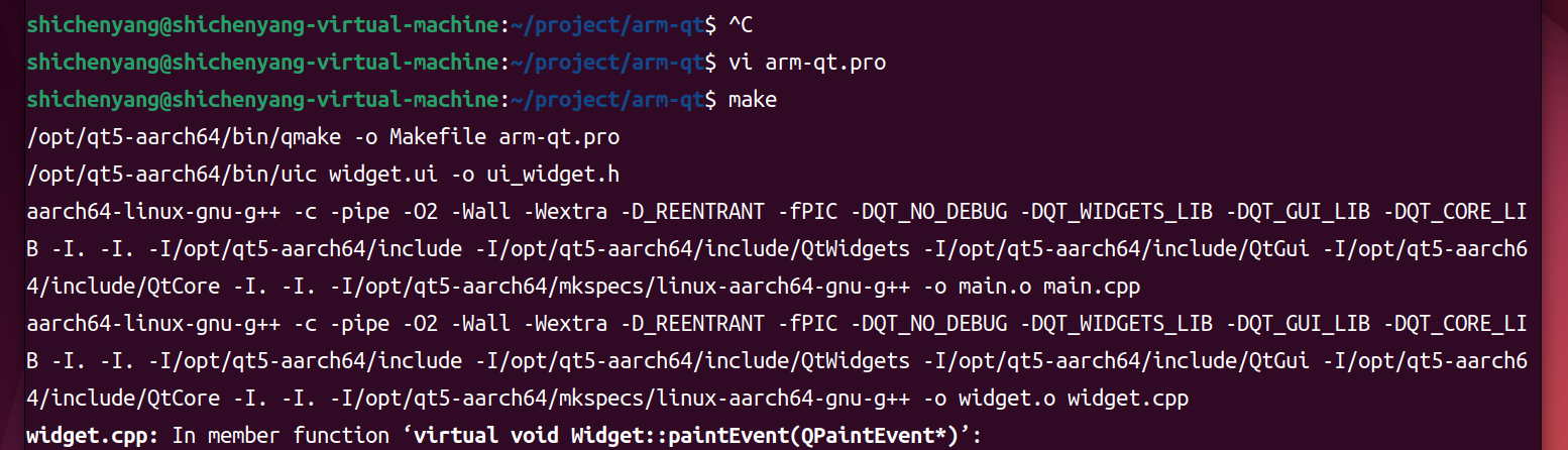 接着依次执行命令/opt/qt5-aarch64/bin/qmake -project,/opt/qt5-aarch64/bin/qmake,make,构建项目并交叉编译。