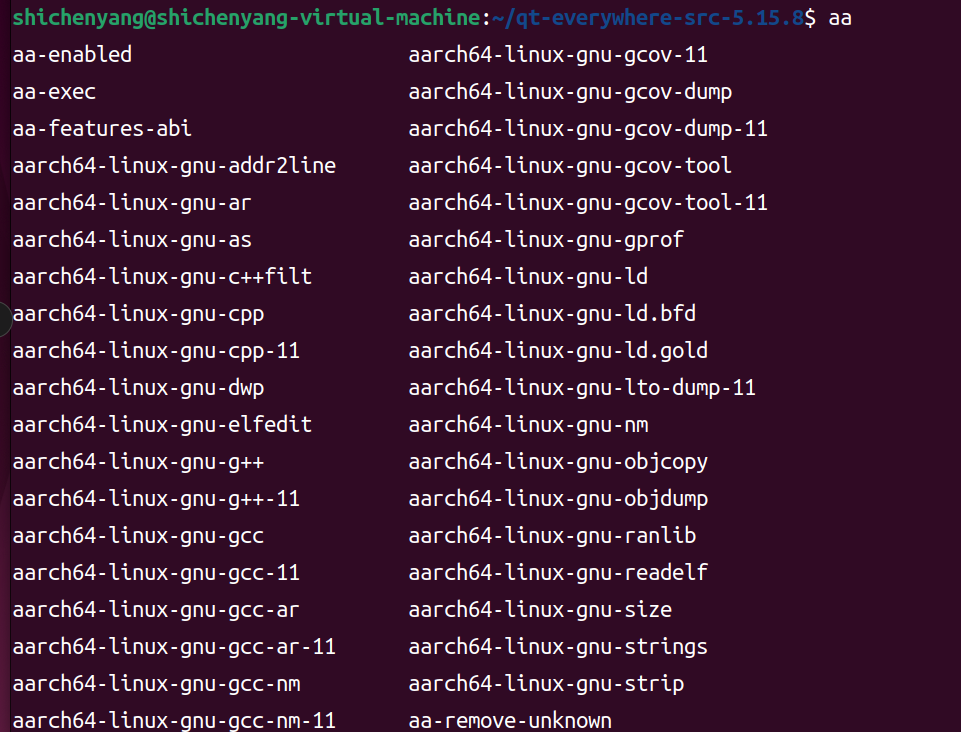 配置之前先检查自己的交叉编译工具,命令行输入aa,然后双击Tab键,可以检查自己的交叉编译工具,如果没有请百度搜索安装。以下是我的交叉编译工具: