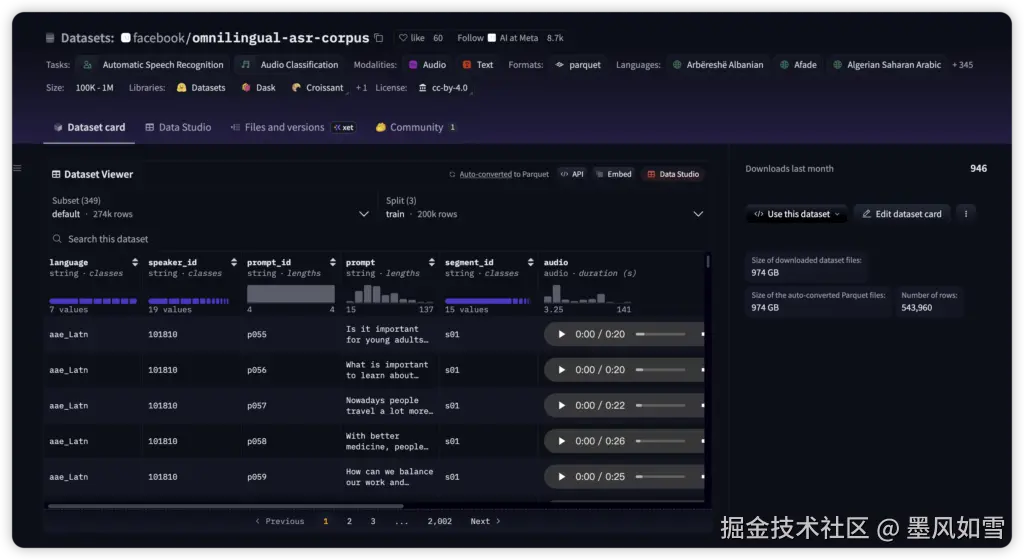 然而,Meta的抱负远不止于此。Omnilingual ASR的发布,不仅仅是技术的胜利,更是一场深刻的普惠与包容行动。Meta通过其开源策略 ,为全球社区带来了真正的福祉:模型采用友好的Apache 2.0许可证 ,而配套的Omnilingual ASR Corpus数据集则采用CC-BY许可 ,两者均可免费用于商业用途。这个"Omnilingual ASR语料库"具有历史性的意义。它包含了针对350种欠服务语言的转录语音,是Meta与全球各地组织(如Mozilla Common Voice、Lanfrica)以及本土说话者通力合作的结晶。这是一个全球合作的典范,旨在打破数据壁垒,为那些曾因数据匮乏而无法被AI识别的"小语种"和"地方方言"提供坚实的基础。