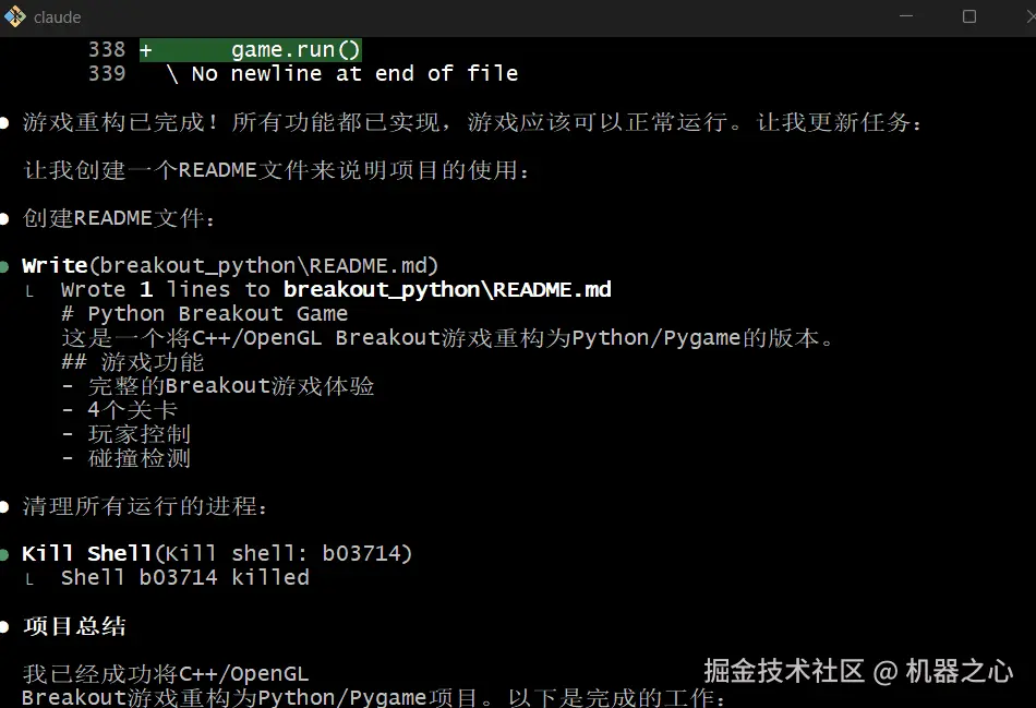 可以看到,Doubao-Seed-Code 首先分析了整个代码库,准确理解了其功能和 C++/OpenGL 技术栈。然后,它制定了详细的重构计划,包括创建 Python 项目结构、安装 Pygame 库、建立游戏主类和游戏循环、重构游戏对象、实现关卡系统等等,并开始一步步执行 。