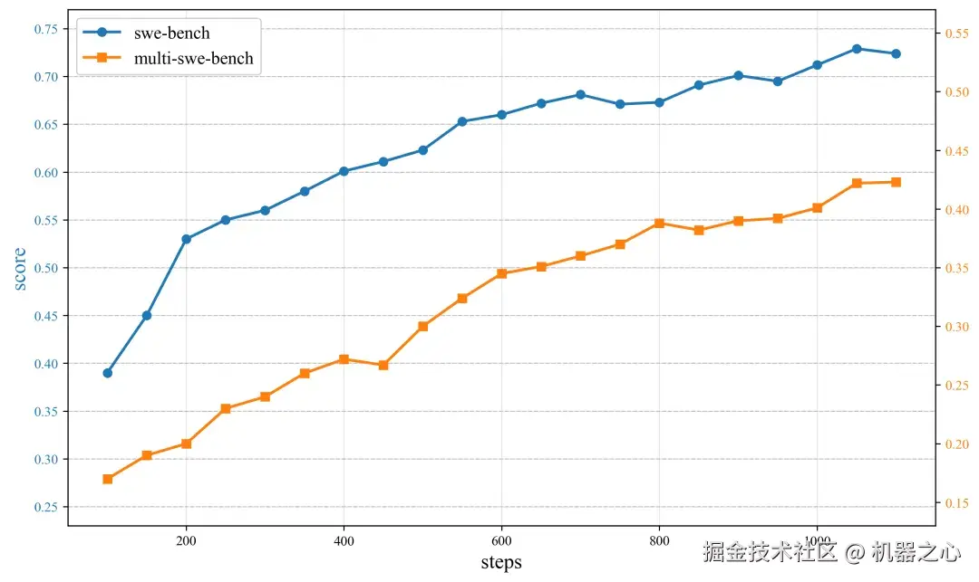如下图的数据所示,在 multi-swe-bench 和 swe-bench-verified 两个基准上,Doubao-Seed-Code 的性能在训练过程中呈现一致的上升趋势,这表明模型具有良好的泛化能力。