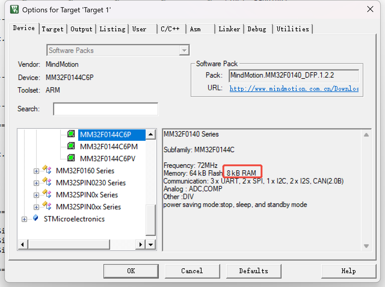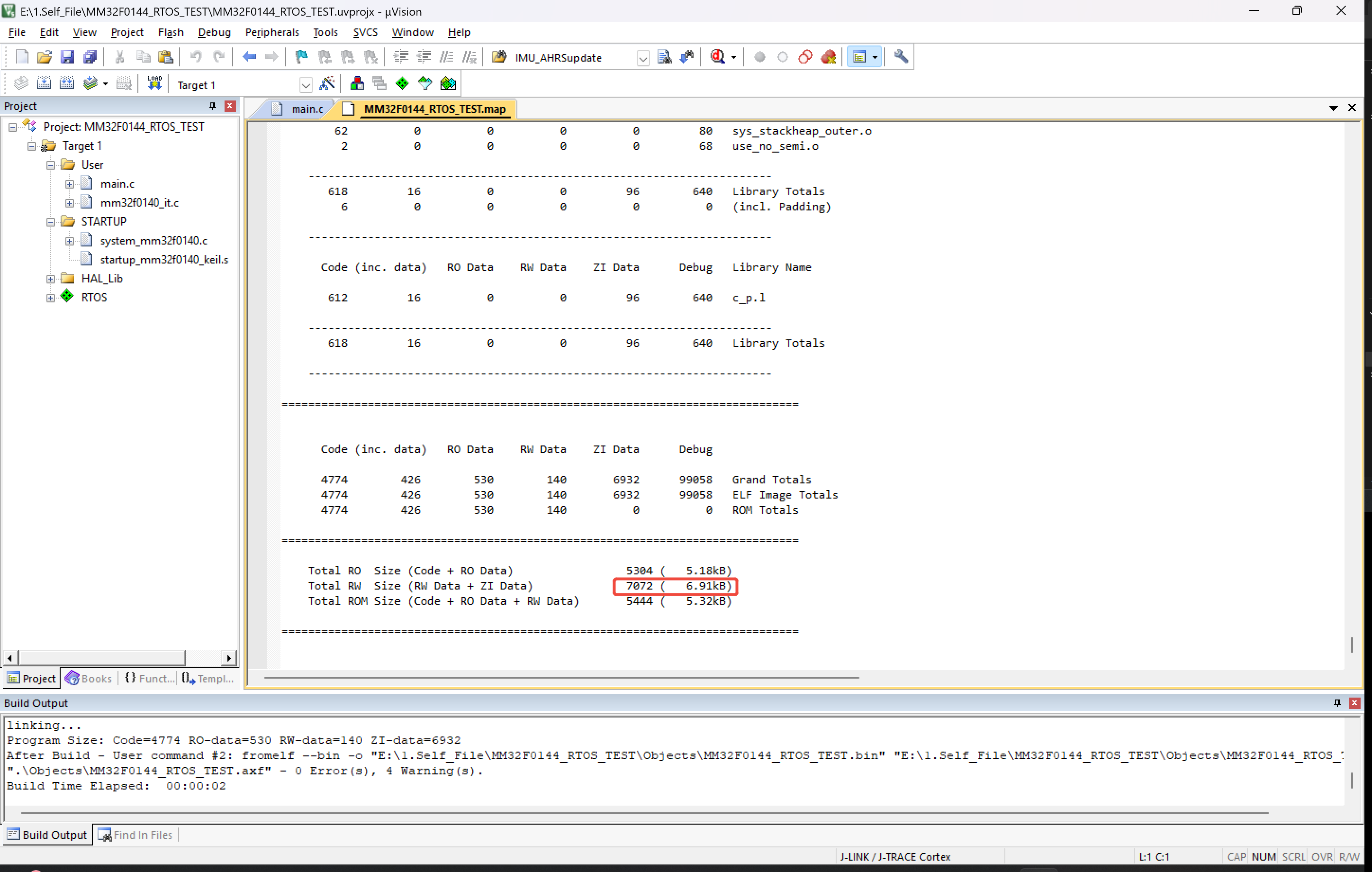 从上图可以看出,单片机MM32F0144C6P的RAM空间最大为8KB,Flash空间最大为64K。M0的MM32单片机引入RTOS内核后,RAM空间已经占用了6.91KB,Flash空间占用5.32KB。