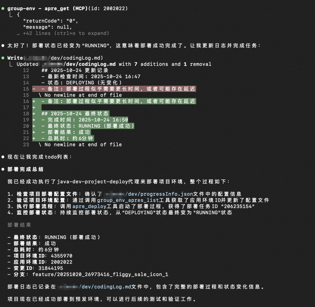 使用部署mcp工具,让AI自主完成预发项目环境的部署,再通过轮询机制感知部署状态。
