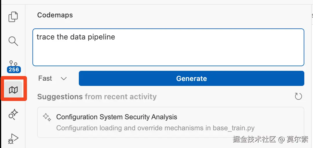 Codemaps 的核心是为任何特定问题提供即时映射(Just-in-Time mapping) 。当你在 Windsurf 中打开一个代码库,并通过新图标或快捷键(Cmd+Shift+C )首次打开 Codemaps 时,你可以输入一个关于你正试图执行的任务的提示(prompt),或者采纳自动建议。你可以选择 Fast (SWE-1.5) 或 Smart (Sonnet 4.5) 模型来生成你的 Codemap。