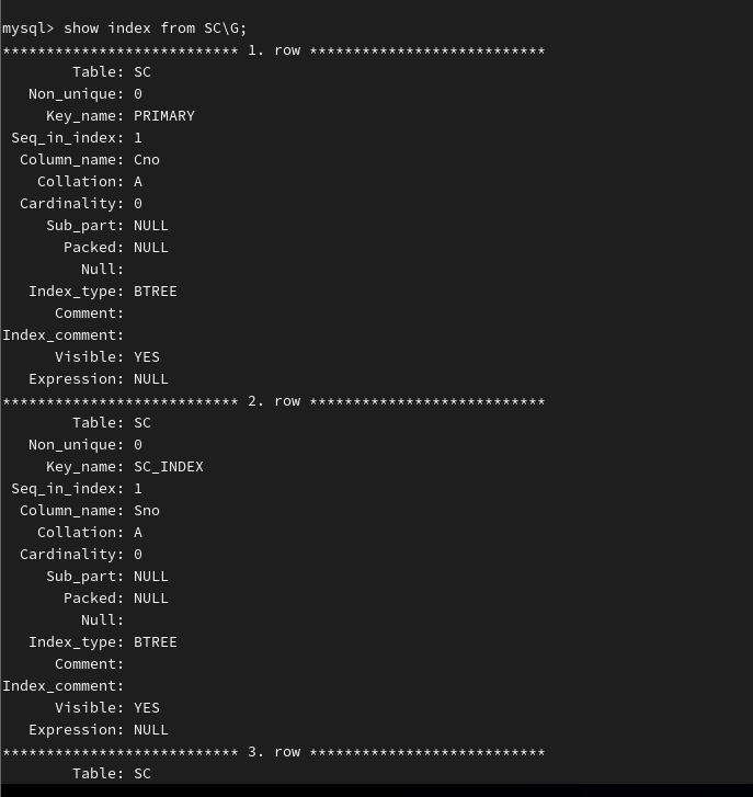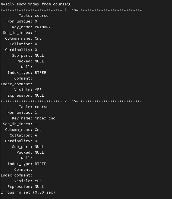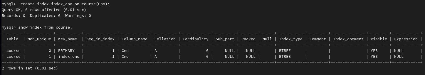 2.为Course表中Cno 课程号字段设置索引,并查看索引