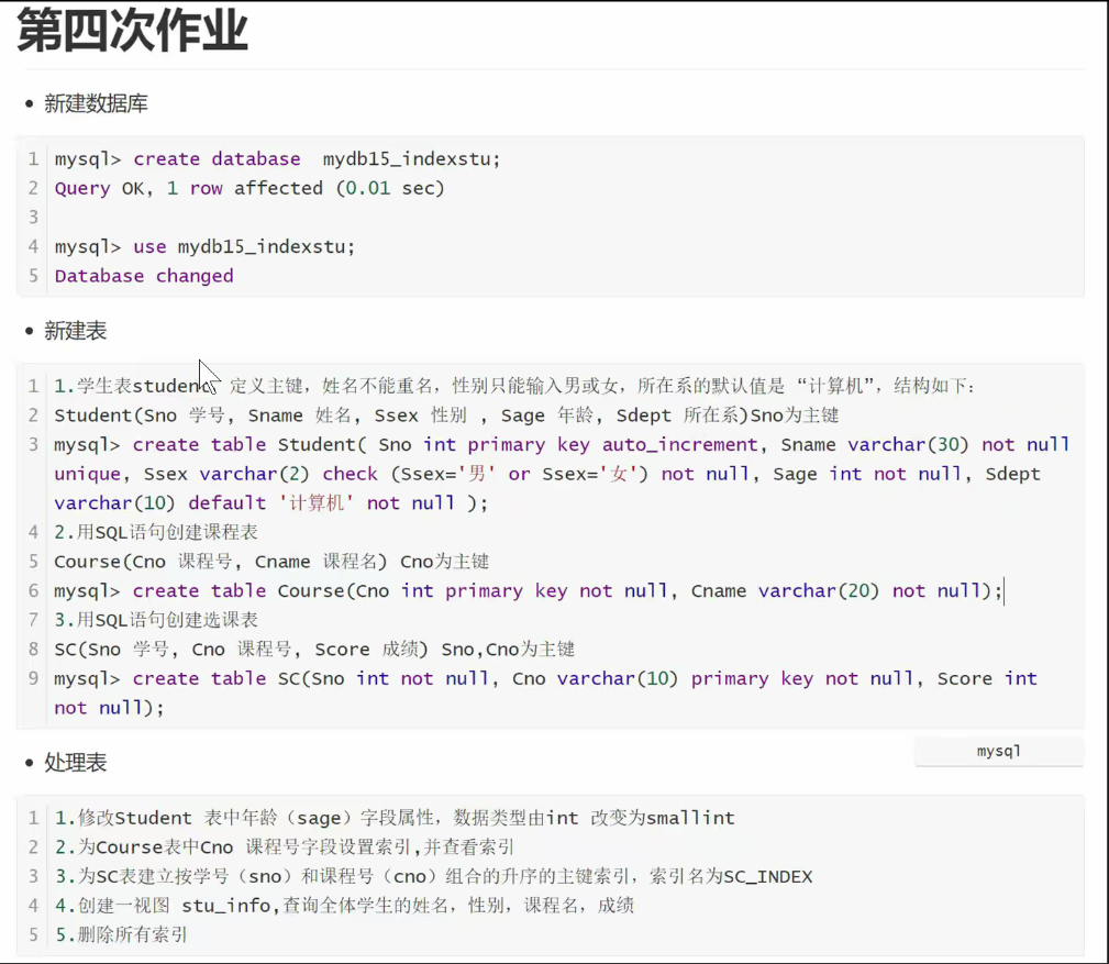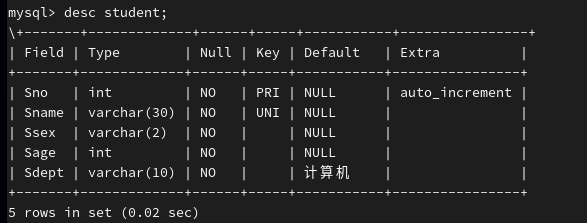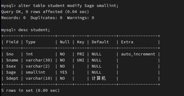 1.修改student 表中年龄(sage)字段属性,数据类型由int 改变为smallint