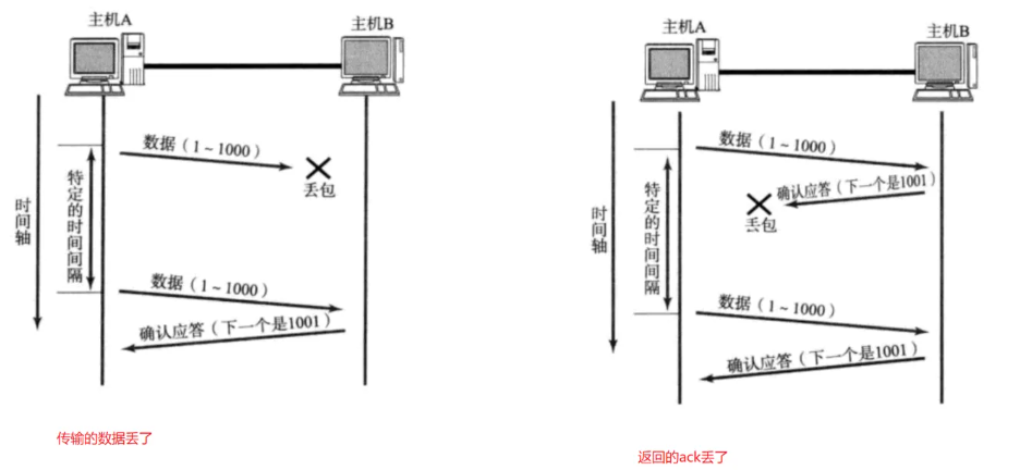 A发送数据给B后,可能因为网络拥堵等原因,数据无法到达B;如果主机A在一个特定时间间隔内没有收到B发来的确认应答,就会进行重发。但是,主机A未收到B发来的确认应答,也可能是因为ACK丢失了。
