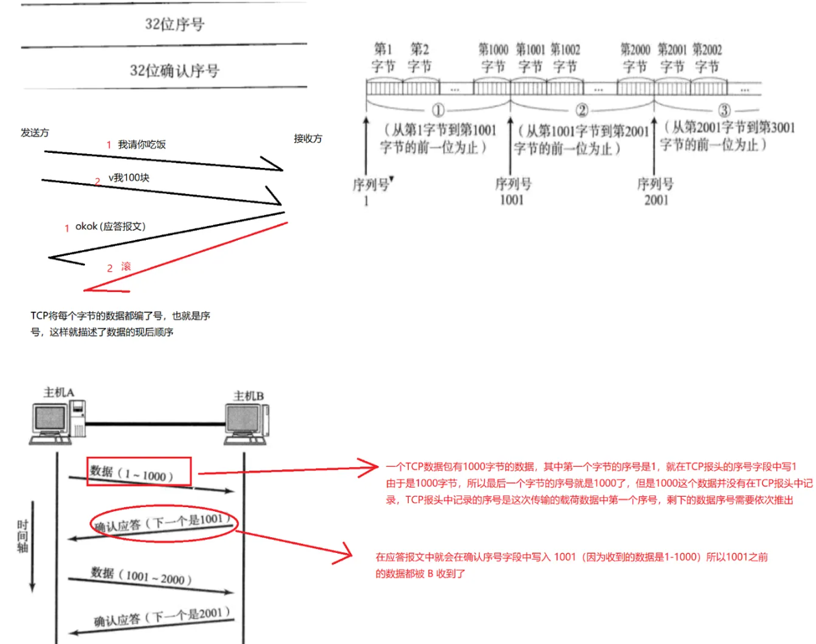 每一个ACK都带有对应的确认序列号,意思是告诉发送者,我已经收到了哪些数据,下一次你从哪里开始发。