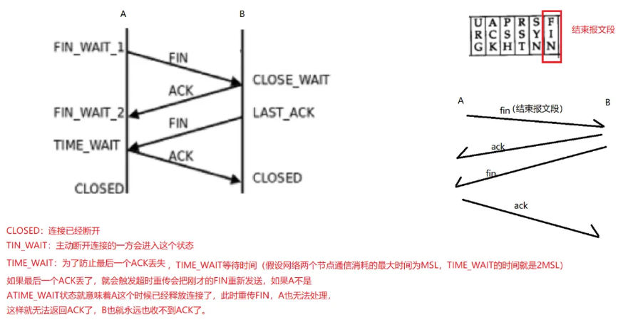TIME_WAIT:连接终止时主动关闭方进入的等待状态,持续时间为2MSL(假设网络上任意两个节点通信消耗的最大时间为MSL,TIME_WAIT等待的时间就是2MSL)