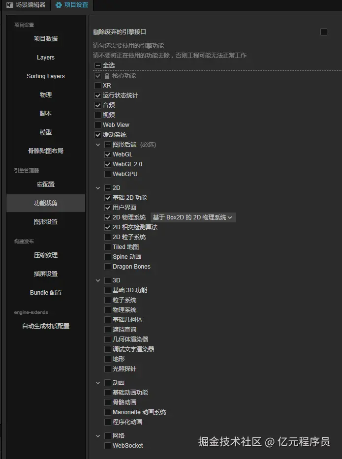 - 引擎裁剪: 在构建时,取消勾选项目根本用不到的引擎模块,比如用不到3D模块、视频播放、WebView等,就一定要把它们去掉,这是最直接的代码体积削减。