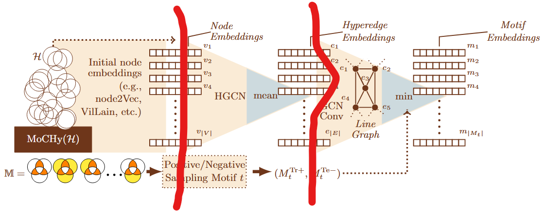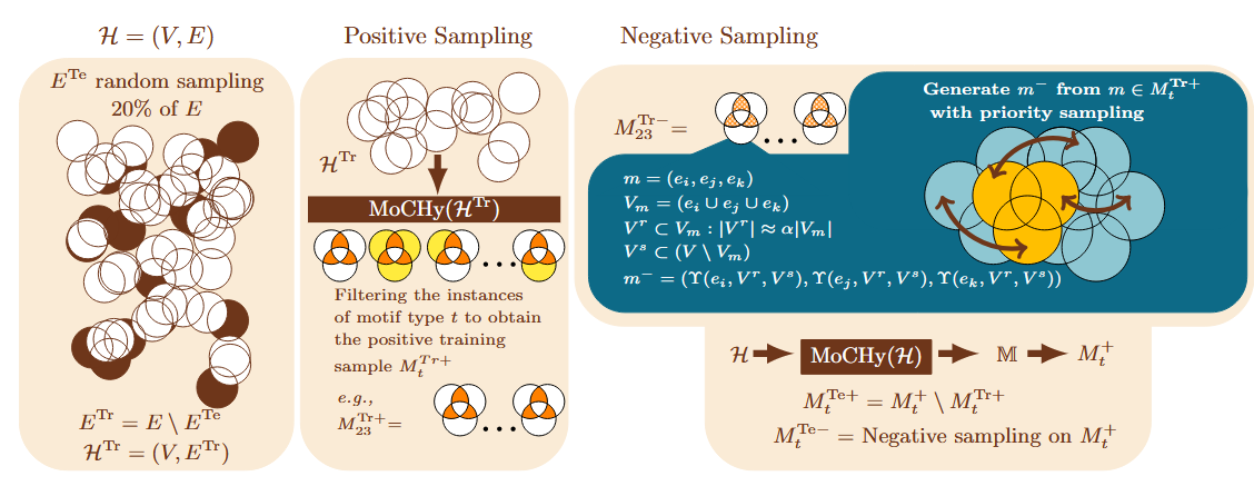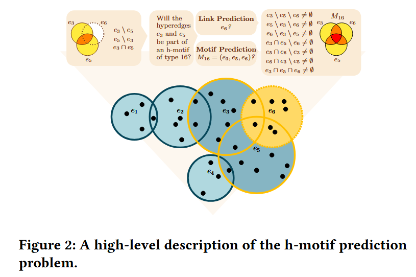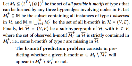 再说回这个预测目标,与上述数学定义联系起来就比较好理解了,我们在上面定义了一个子超图,它是完整超图的一部分,作者所做的工作,就是在子超图上预测某个不存在在子超图上的(即缺失的特定类型的h-motif)是否会出现在完整超图上。