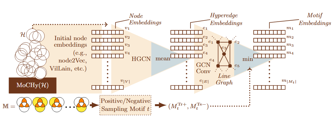 第三部分是本论文的核心,首先,作者先将超图转化为线图。将超图转化为线图后,就可以使用传统的GCN对线图进行处理,学习能够捕捉超边间结构相关性的优化后超边表示,随后对这些优化后的表示进行池化操作(对应上图min操作),最终得到高阶基序的嵌入。