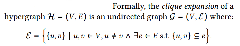 其中一种方法,由超图形成的普通图被称为团扩展图(其核心逻辑是 "把超边中的所有节点,两两之间都连一条边")(英文名:clique expansion,不知道翻译准不准确),上图中左侧的无向图正好就是右侧超图的团扩展图。