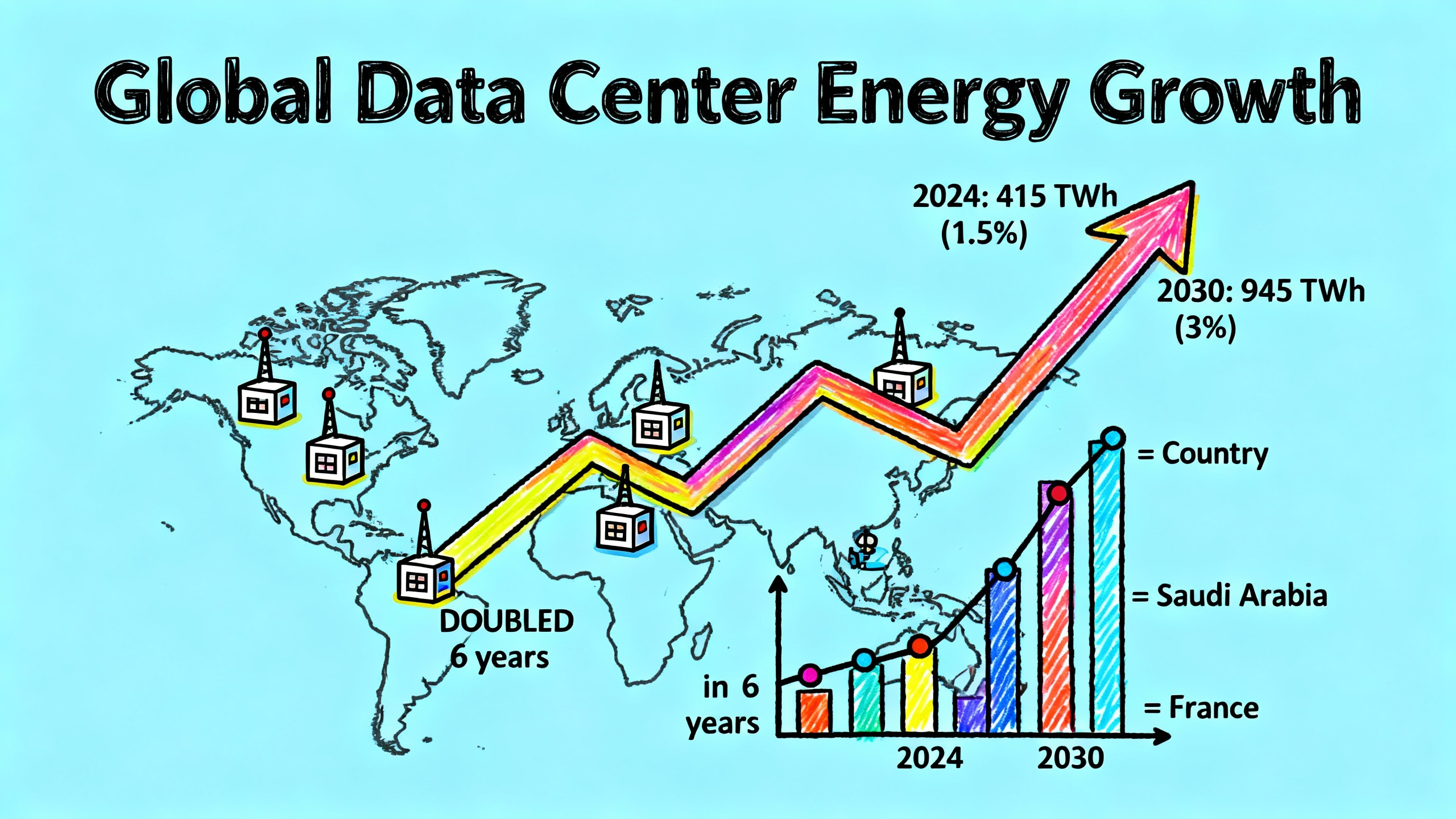把视角拉到整个行业,情况就不一样了。2024 年,AI 数据中心的耗电量已经相当于沙特阿拉伯一个国家的用电量。到 2030 年,这个数字可能会超过法国。而且这还只是保守估计,如果 AI 应用的增长速度超出预期,能耗增长可能会更快。
