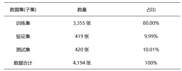 本研究采用"肺炎检测"数据集,共 4,194 张样本。基于随机划分原则,将数据集划分为训练集、验证集与测试集,比例约为 80% / 10% / 10%,对应数量如下: