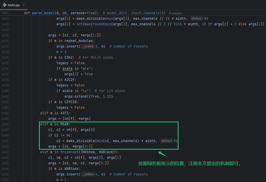 根据前述步骤,在 parse_model 函数中进行必要的修改。这一步骤确保新模块能够正确集成到现有的模型架构中,并与其他模块顺利协作,确保模型整体的协调性与功能性。