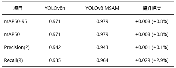 以下为YOLOv8n(原版)与YOLOv8 MSAM(改进版)的核心指标对比表: