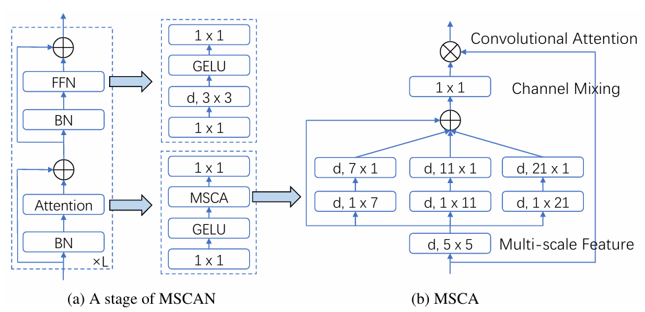(1)多尺度通道注意力(MSCA):通过4路深度可分离卷积(DWConv,k=5/7/11/21)并行汇聚,提取多尺度特征。