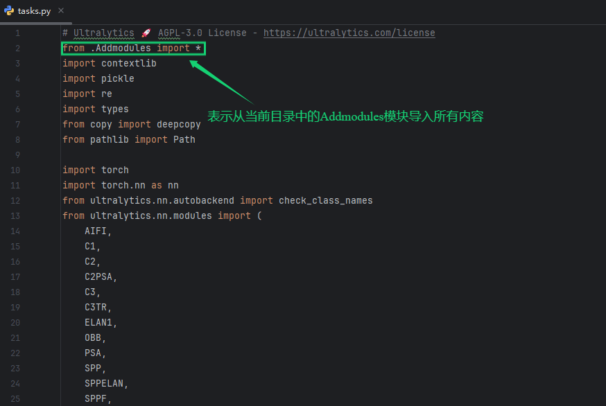3.在 'ultralytics/nn/tasks.py' 文件中完成必要的导入和模块注册(如果该目录已存在于现有的算法改进文件中,则无需重新创建,可以跳过此步骤,直接进入第四步)。该步骤确保模块能够在系统中正确识别并顺利调用。