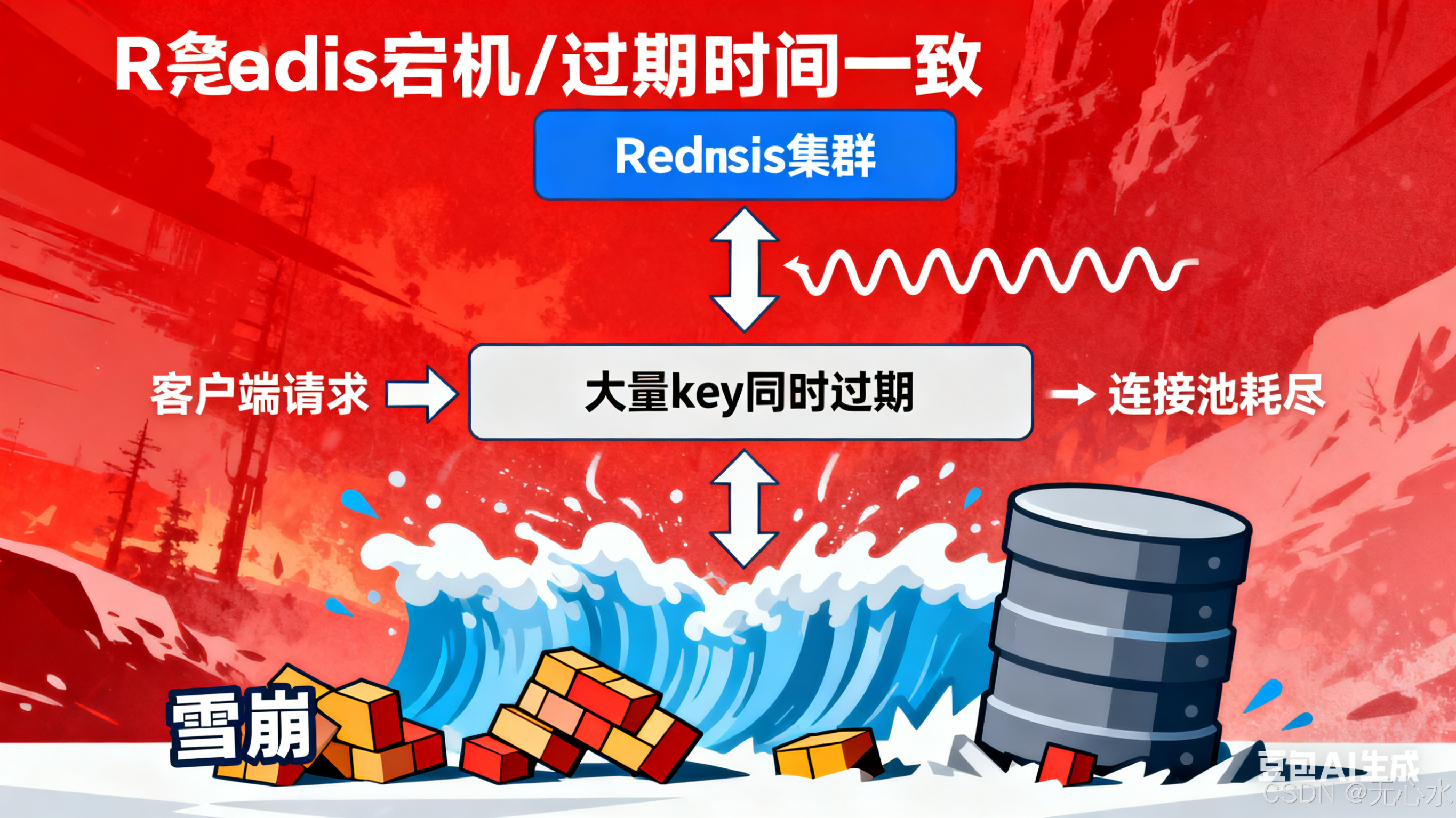 定义 :缓存中大量key在同一时间过期,或缓存集群宕机,导致所有请求瞬间落到数据库,数据库直接被压垮。