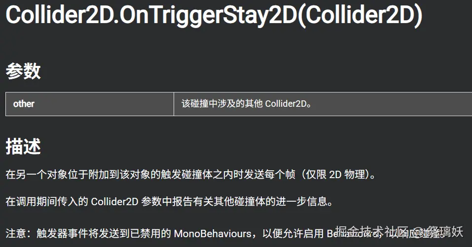 可以看到我调用的是OnTriggerStay2D方法,再次查询Unity手册可以看到关于OnTriggerStay2D方法的描述: