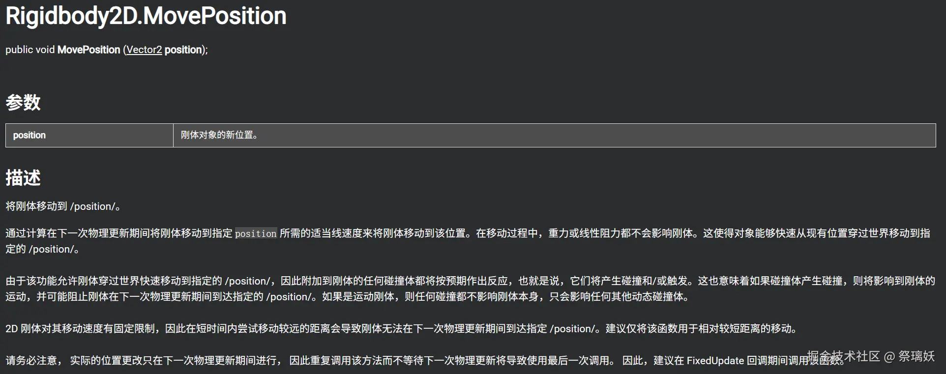 可以看到人物调用了MovePosition这个方法来实现快速移动,根据unity官方手册我们可以看到关于他的描述: