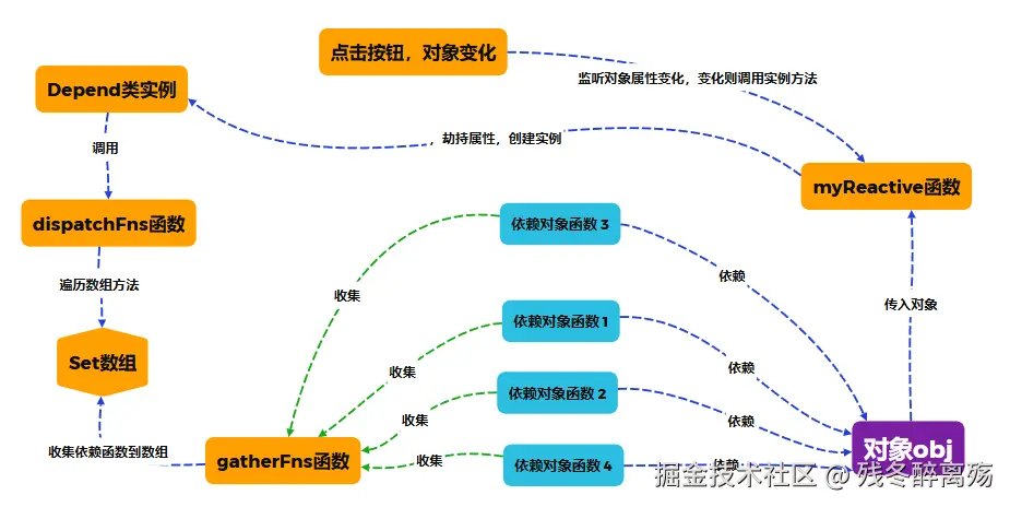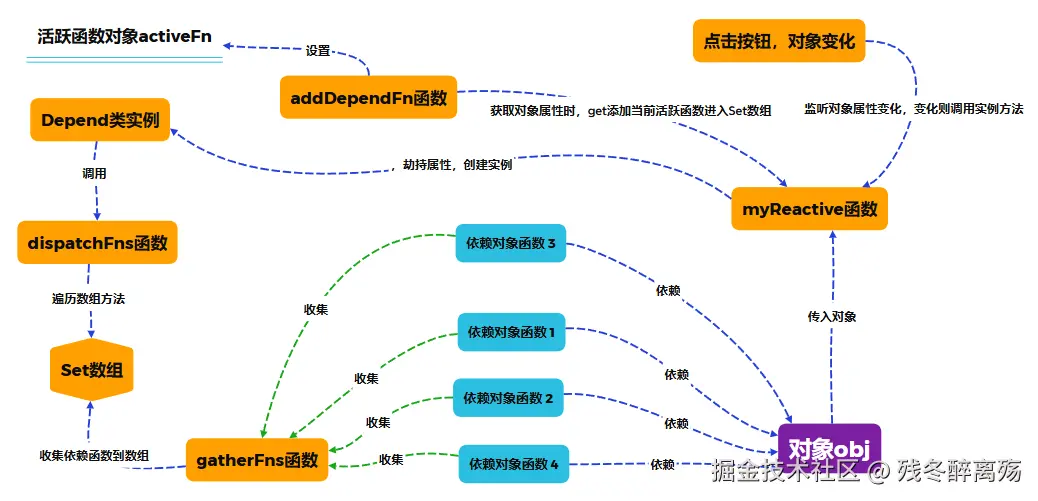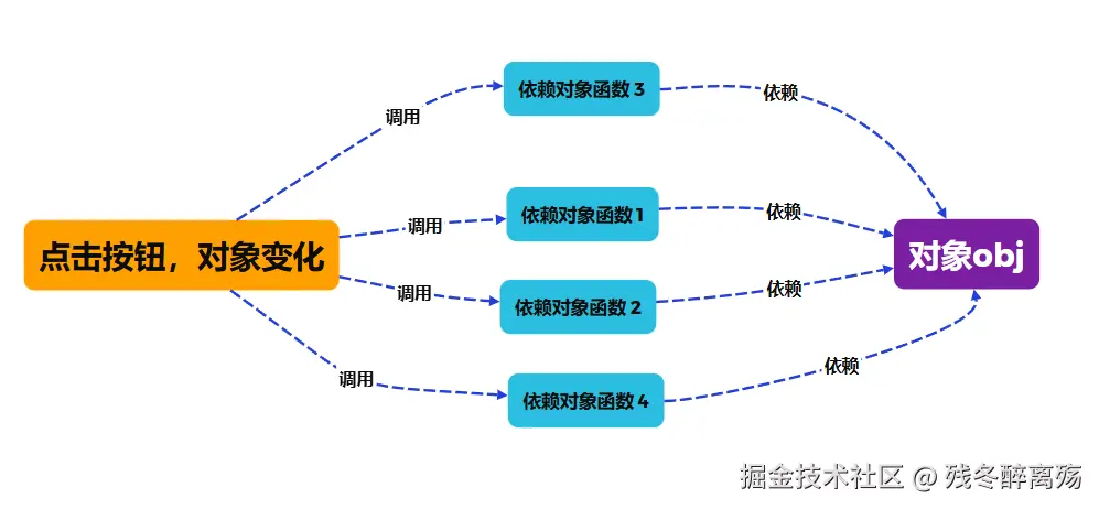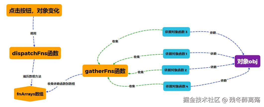 这样,我们只需要调用一次dispatchFns(),所有依赖函数都会执行。但这种方式依然不够灵活,如果多个数据对象拥有各自的依赖函数,管理起来会非常混乱。