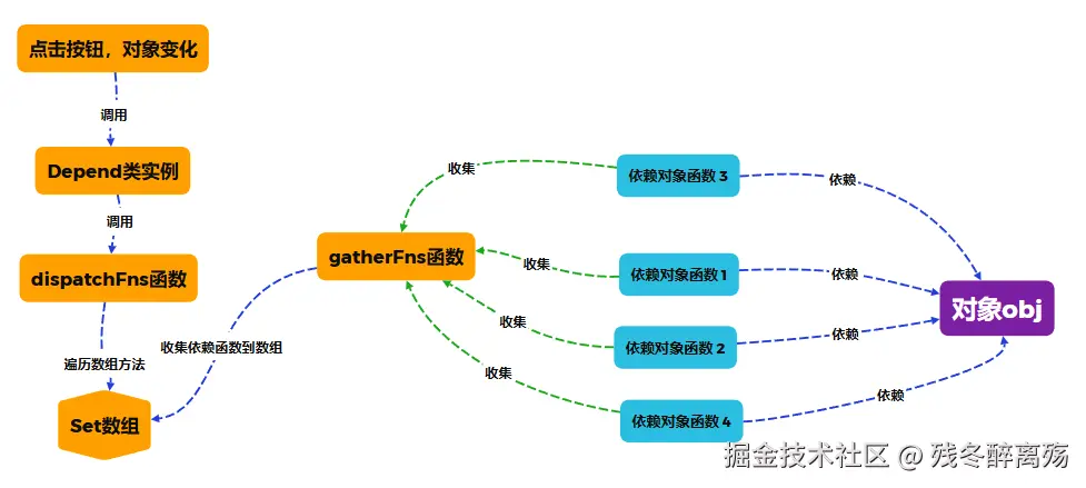 为了解决上述问题,我们可以把所有依赖函数收集到一个数组中,当数据变化时,统一遍历执行。