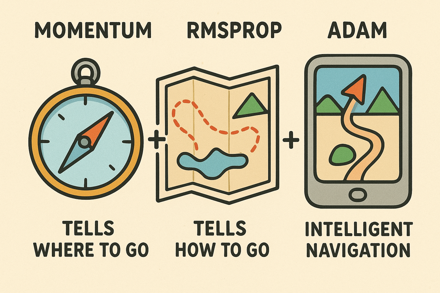 | Adam | 同时计算一阶矩(方向)和二阶矩(幅度),并做偏差修正。综合Momentum的"稳方向"和RMSprop的"调步长"。 | 像个智能导航系统:Momentum告诉你该往哪走,RMSprop告诉你怎么走得稳,两者合体成了"自动驾驶模式"。 |