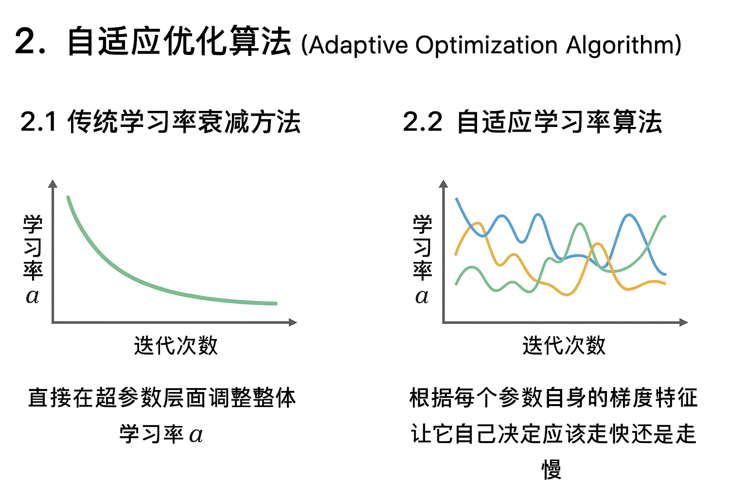 | 自适应学习率算法 | 不再改α本身,而是让每个参数在更新时都带上"自调节比例",实现隐式学习率。 | 就像每个车轮都能独立判断地面情况,自主控制转速,整体协调而智能地前进。 |