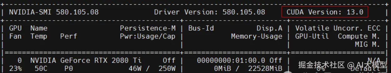 nvidia-smi 显示的CUDA版本是驱动程序支持的最高 CUDA版本,不是实际安装的CUDA版本,使用
