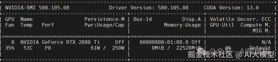 # 若输出显示显卡信息、驱动版本,则安装成功nvidia-smi