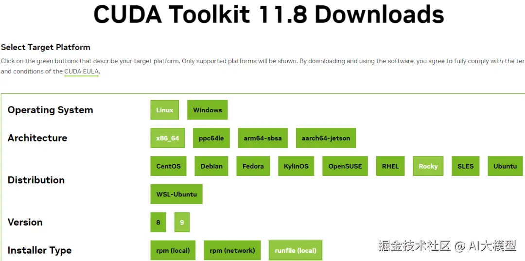 RTX 2080 Ti 的最优 CUDA 版本为 11.7 或 11.8 ,我们选择 11.8 版本下载,下载地址:developer.nvidia.com/cuda-toolki... ,找到对应的版本,选择合适的环境下载。下载后,文件存放到 /usr/local/src